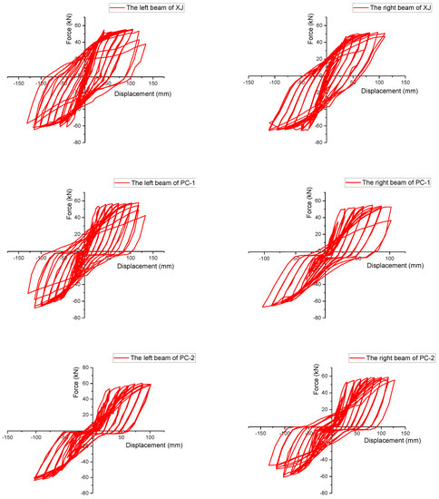 This was owed to the fact that the rubber washers between the bolts and steel plates would deform greatly under a small load at the early stage of loading. Thus, the initial shrinkage phenomenon of precast specimens PC-1 and PC-2 was obvious. After the specimens entered the elastoplastic stage, the slippage of PC-1 and PC-2 was smaller than in the initial stage. This is because the rubber washer was compressed so thin that the elastic modulus thereof was close to that of the concrete. Compared with the specimen XJ, the hysteretic hoop areas of PC-1 and PC-2 were smaller. This implies that the energy-dissipating capacity of precast specimens with rubber washers is poorer than the monolithic specimen. For the precast specimens, due to a manufacturing error, the right beam of PC-1 and the left beam of PC-2 were stopped before the test completed. Compared to the left beam of PC-1, the hysteretic hoop areas of PC-1 were smaller. It indicated that with the thickness of the rubber washers increased, the energy consumption of the beam became worse.