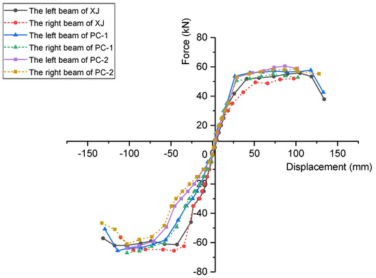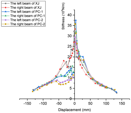 Figure 9. The skeleton curve trend of the three specimens is similar. However, compared with the three specimens under the negative load, the stiffness of precast specimens was obviously lower than specimen XJ before the displacement reached 75 mm. This is due to a larger compression in the precast joint region caused by the rubber washers than the monolithic joint. The rubber washer in PC-2 (4 mm) is twice the thickness than that in PC-1 (2 mm), which means that the joint region in PC-2 can be compressed more than PC-1. Therefore, the stiffness of PC-1 is slightly higher than PC-2 under the same stage. This phenomenon indicates that increasing the thickness of the rubber washer could reduce the stiffness of the specimens. It achieves the target to control the stiffness of beams by adding a different thickness of the rubber washer. It is obvious that the ultimate bearing capacity and the ultimate displacement of the three specimens are almost the same.