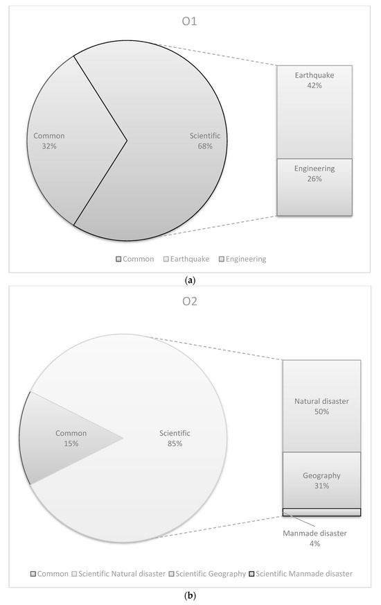 Opinions were coded as concepts, and the percentages of scientific vs common concepts indicated that participants emphasized scientific concepts more frequently than common concepts in this science communication experience. Figure 1a,b shows the ratio of scientific concept in two items at 68% and 85% respectively. Within the scientific concept, different concepts were identified and calculated in percentages. Earthquake concepts (42%), such as magnitude, intensity scale, and resonance effect, is the topic participants mainly refer to in the first question. In question number two, Natural disaster concepts (50%), such as typhoon, torrential rain, and debris flow disaster, are the main theme in participants’ answers.