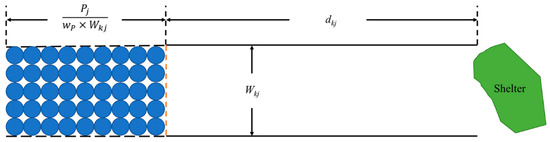 Equation (1) aims to minimize total evacuation time (TET) of all communities to their ISs where dkj is the shortest distance from community j to shelter k that can be obtained using the Dijkstra algorithm. The parameter Pj is the number of evacuees in community j. The parameter wp indicates the average path width that an evacuation occupies and Wkj is the average width of the shortest route from community j to shelter k. The parameter vj is the average evacuation velocity of community j considering the velocity of proportions of the community’s children, adults, and elderly people, which are calculated as in the work of Zhao et al. [24]. Decision variable Bkj indicates whether the community j will be allocated to shelter k (allocated = 1, not allocated = 0). In Equation (1), the evacuation time of a community is the time that all evacuees of the community arrive at their shelter. Here, the distance for the final evacuee of a community is adjusted by the number of evacuees of this community, the occupation width of an evacuee, and the width of the evacuation route as shown in Figure 1.