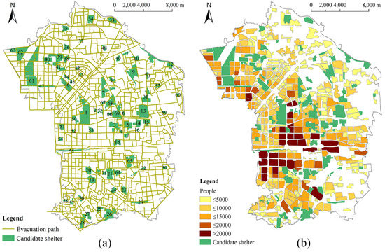 (a) Candidate shelter and evacuation paths, and (b) community population distribution and candidate shelter location.