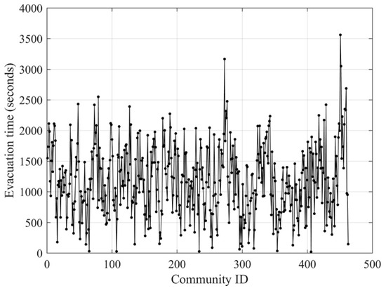 By using the MPSO algorithm on a laptop with 16 GB memory and a 2.2 Hz Intel Core i7, the result of the model’s IS stage was obtained. The execution time of the MPSO to solve the model’s IS stage was around five minutes. The value of objective f1 was 547,060 s, and the evacuation time of each community is shown in Figure 4. It can be seen that most of the evacuation times for these communities were lower than 2500 s and that only evacuees of five communities will take more than 2500 s to reach their ISs. Moreover, 57 communities could arrive at their ISs within 500 s. This indicates that under the location and allocation scheme obtained using the model’s IS stage, evacuees of each community can obtain safe protection quickly after an earthquake.