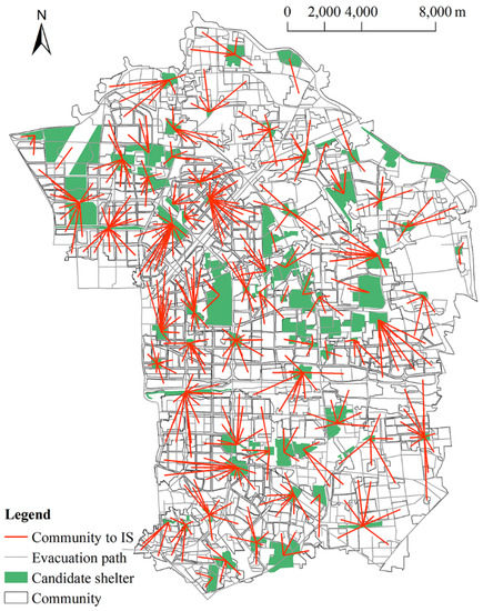 Figure 6 indicates that all ISs were also selected to be STSs in the model’s STS stage. However, 29,457 evacuees in shelter 53 should go to shelter 52 in the STS stage as shelter 53 did not have enough capacity to house all of the evacuees allocated to it in the IS stage. The evacuation time of each of these evacuees was around 2002 s.