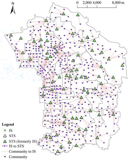 In the STS stage of the model, all of the 463 candidate shelters could potentially be selected as STSs, including those which were selected as ISs in the model’s IS stage. More precisely, among these 463 candidate shelters, 68 shelters were determined to be ISs according to the results of the model’s IS stage. The 68 ISs selected in the IS stage may be selected as STSs in the STS stage. With the MPSO algorithm applying, the result of the STS stage was obtained, as shown in Figure 6. The MPSO algorithm was executed on a laptop with 16 GB memory and a 2.2 Hz Intel Core i7, and its execution time was around five minutes.