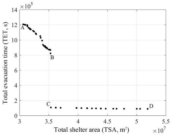As there are two objectives and two constraints in the model’s LTS stage, the problem is a little complex and involves a large number of decision variables. There are two main methods for solving the model with multiple objectives. One is converting the multi-objective problem to a single-objective problem by summing the weighted value of these objectives. The other one is using the Pareto-based method to obtain a Pareto solution set. In this paper, as the weights of the two objectives of the model’s LTS stage are not specific, the Pareto-based method was employed. With the application of an interleaved MPSO-GA algorithm on a laptop with 16 GB memory and a 2.2 Hz Intel Core i7, the model’s LTS stage was solved, and the Pareto solutions obtained are shown in Figure 7. Nine replicates were performed with the algorithm to ensure more accurate results. According to the execution process, the Pareto set stays the same after seven executions. The average execution time is around forty minutes. There were a total of 50 solutions in the Pareto set, as shown in Figure 7. With the increase in TSA, the value of TET decreased. Furthermore, there was a sudden decrease in TET from solution “B” to solution “C”. The solutions labeled “A” and “D” signify those at either end of the Pareto front. For solution “A”, TSA is the least compared with that of other solutions. However, the evacuees needed to take more time to reach their shelters. When the investment budget is not enough, this solution may be an option for the decision-makers. For solution “D”, TSA is highest, ensuring that evacuees can arrive at their shelters in less time. Comparing solution “A” and “B”, it can be seen that the TET decreased from approximately 1,200,000 s to 800,000 s, whereas the TSA increased from approximately 30,000,000 m2 to 35,000,000 m2. However, from solution “B” to “C”, TET decreased sharply from approximately 800,000 s to 100,000 s, whereas the TSA was approximately 35,000,000 m2 for both. In contrast, the TET of solutions “C” and “D” were similar, whereas the TSA increased from 35,000,000 m2 to approximately 52,500,000 m2. In Section 4.4, solutions “A”, “B”, “C”, and “D” in Figure 7 are analyzed.
