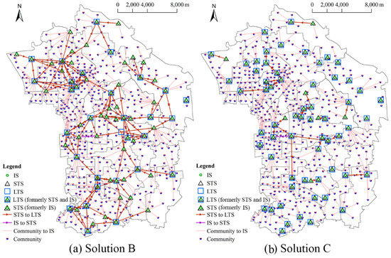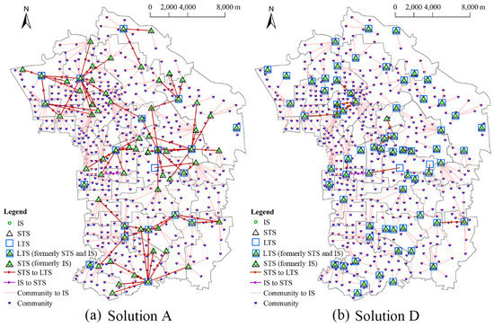 With the solution of the IS, STS, and LTS stages of the model, the shelter location and evacuee allocation of Chaoyang District were obtained. There is only one solution for the model’s IS and STS stages but fifty solutions for the model’s LTS stage. Thus, there are fifty solutions for the selection of ISs, STSs, and LTSs, and the allocation of the evacuees to these. Taking solutions “A” and “D” as examples, the location of ISs, STSs, and LTSs and how evacuees are allocated to them in different stages are presented in Figure 8a,b, respectively.