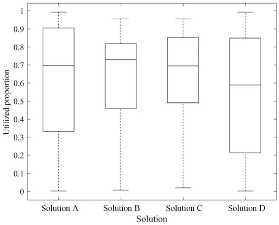 The utilized proportion ranges of LTS area for solutions “A”, “B”, “C”, and “D” are shown in Figure 10. It is obvious that the range of solutions “A” and “B” is wider than the range of the other two solutions. The minimum utilized proportion of these four solutions is similar, although that of solution “C” is a little higher. The maximum utilized proportion of solution “A” is higher than that of the other three solutions, which is around one. The utilized proportion of solution “B” and “C” is concentrated around 0.45–0.85, which means that the utilized situations of all LTSs under these two solutions are similar.