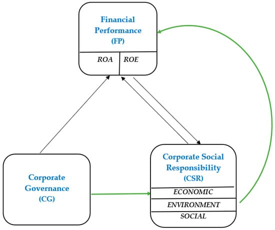 As we have previously underlined, the main objective of this study is to analyze the causal links that arise between the considered variables: corporate social responsibility (CSR), financial performance (FP), and corporate governance (CG), at the level of large European companies. The conceptualization of these relationships is explained by the model enclosed in Figure 1.