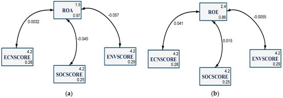 Figure 2a,b shows the estimated coefficients between the CSR variables (economic—ENCSCORE; social—SOCSCOR; environment—ENVSCORE) and the financial performance expressed, progressively, through ROA and then ROE, indicating the power and trajectory of this dependency, thus: