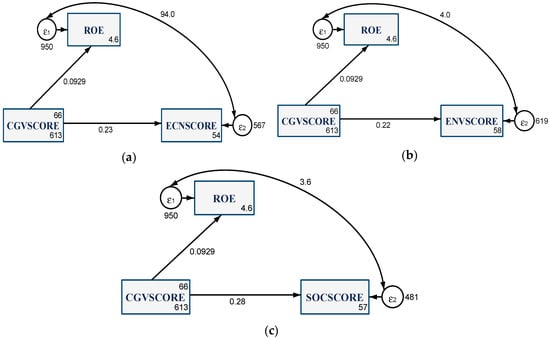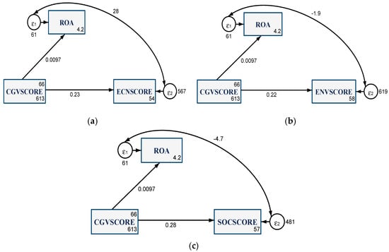 Summarizing the results of these equation models, we can affirm that ROE is influenced and influences positively the economic dimension of CSR (ROE-ECNSCORE: positive, bidirectional, and statistically significant correlations). In the case of ROA, the significant correlations are negative and are established with the social and environmental dimensions of CSR. All other combinations of dependencies are not statistically significant. It is important to note that a significant, negative impact, in the case of the CSR-FP relationship, was also observed throughout different studies [,]. It is however necessary to state that these are only partial equation models, the scientific hypotheses need to be tested in the context of a global model that encompasses all dependencies among variables, both direct and indirect.