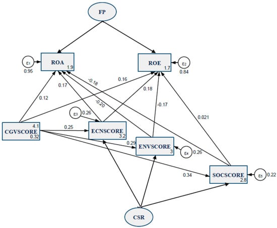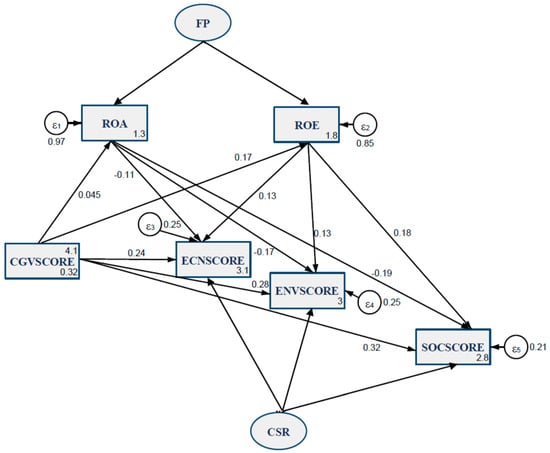 In order to highlight the overall interlinkages (direct, indirect, and total) between the variables of corporate social responsibility (CSR), financial performance (FP), and corporate governance (CG), we have employed the method of structural equation modeling (SEM) [].