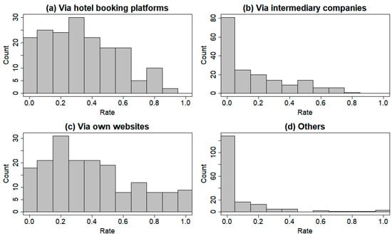 The results reveal that about 89.1% of hotel firms used at least one hotel-booking platform. Even if we consider that the respondents may have more interest in hotel-booking platforms than non-respondents, we believe that a large proportion of these hotel firms use such platforms. Specifically, Figure 1 shows the distribution of the use rate of each channel for capturing customers, including platforms by hotel firms. The results show that the mean value of the use rate via hotel-booking platform was about 33.8%; via travel agency, about 18.0%; via own website, about 39.6%; and via other channels, about 8.6%. Accordingly, the major channels for capturing customers of hotel firms in 2017 were hotel-booking platforms and own websites.