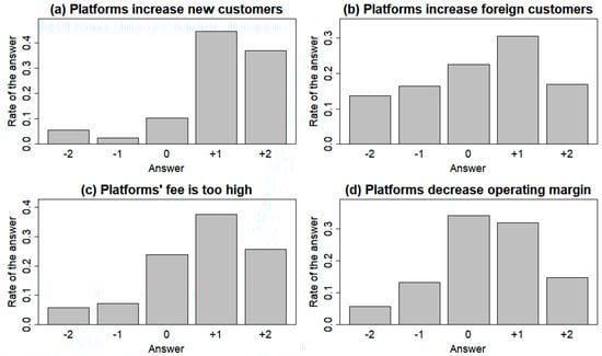 Figure 2 shows the evaluation results of the advantages and disadvantages of using hotel-booking platforms. About 81.7% of respondents agreed that “platforms can increase the number of new customers” (Figure 2a), and about 47.4% of them agreed that “platforms can increase the number of foreign customers” (Figure 2b). Meanwhile, about 63.1% of the respondents stated, “transaction fees of platforms are too high” (Figure 2c), and about 46.7% considered that “the platforms’ transaction fees reduce their operating margin” (Figure 2d). In summary, we confirmed that although a large portion of hotel firms perceive benefits from the platforms, a significant portion also disagree with the platform fee and the perceived loss of profits because of such platforms in Japan.