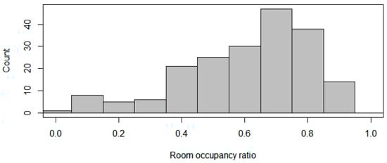 Additionally, Figure 3 shows the distribution of the room occupancy of hotel firms. The ratio values of most firms were within the 0.4–0.9 range, the mean value was about 0.61, and the mode value was 0.7. Accordingly, there was excessive supply in the Japanese hotel market, and spaces for market growth using the platforms remained.