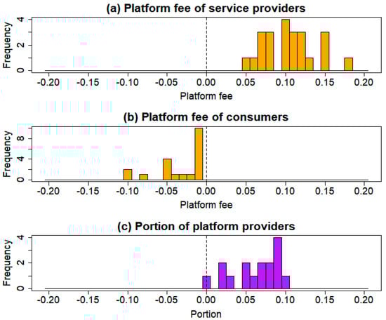 First, we set the platform fee as charged for each transaction, and not fixed with reference to actual hotel-booking platforms. The transaction fee is charged as the service price. The negative value of the rate denotes incentive. We set the range from −0.2 to 0.2, since the actual maximum platform transaction fee is about 20% of the service price, as in Figure 4. The simulation experiment can be conducted comprehensively by changing the platform fee of the service provider agents and consumer agents. As shown in Figure 4, we can confirm that the current portions of platform providers in platform fees are from 0 to about 0.1. Accordingly, we test the platform fee settings that satisfy the 0.05 portion for platform providers. Specifically, the combinations are as follows: (platform fee of service provider agents, platform fee of consumer agents) {(0.2, −0.15), (0.15, −0.1), …, (−0.15, 0.2)}.