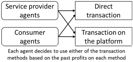 Both service provider and consumer agents can change their condition by either “using the platform and transacting with the opposite side (service provider agents or consumer agents) via the platform” or “not using the platform and transacting with the opposite side directly”, as shown in Figure 5. The change of status is based on past profits in each method. Here, we assume that consumers do not use any hotel-booking platforms to search and book hotels when transacting with the opposite side directly. In the real world, consumers can use internet search engines to access any hotel’s website, and can book rooms directly. In our study, when consumer agents use the platform, they can refer to all the services from service pools on the platform. Conversely, when consumer agents do not use the platform, they can only refer to a limited number of services from the service pools not provided on the platform. Actually, almost all hotel-booking platforms have function sorting or extracting preferable services, which can support the consumers’ searching ability and reduce time cost.