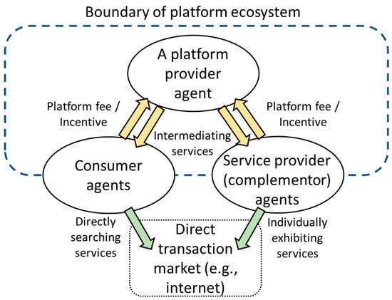 Platform-based markets have a huge influence on human life in current society. Researchers have developed the concept of platform ecosystems [,]. Platform ecosystems are communities orchestrated by platform providers, outside complementors, and consumers [,,,]. A “business ecosystem” is an “economic community supported by a foundation of interacting organizations and individuals—the organisms of the business world; the member organisms also include suppliers, lead producers, competitors, and other stakeholders” [,]. A platform ecosystem restricts its scope to relevant actors, such as the platform itself as well as its providers and users. However, platform ecosystems do not generally restrict participation or withdrawal. Therefore, although a platform ecosystem has boundaries, it is an open system; that is, its composition may not mandatorily converge to any specific state because of outside interaction [].