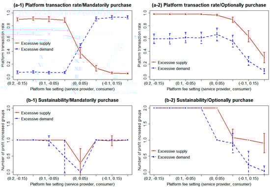 First, we verify the results of the market with mandatory purchase. As Figure 7a-1 shows, in excessive supply, the platform transaction rate became high at the consumer incentive settings. Conversely, in excessive demand, the platform transaction rate became high at the service provider incentive settings. Therefore, in a market of mandatory purchase, Hypothesis 1a was supported. However, as Figure 7b-1 shows, the degree of sustainability was not higher than 1 in any case of mandatorily purchasing market; that is, either/both the profits of consumers or service providers were decreased by the introduction of the platform in all cases. Therefore, for a market with mandatory purchase, Hypothesis 1b was not supported.