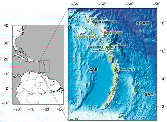 - Maury, R.C.; Westbrook, G.K.; Baker, P.E.; Bouysse, P.; Westercamp, D. Geology of the Lesser Antilles. In The Geology of North America; Geological Society of America: Boulder, CO, USA, 1990; pp. 141–166. [Google Scholar]