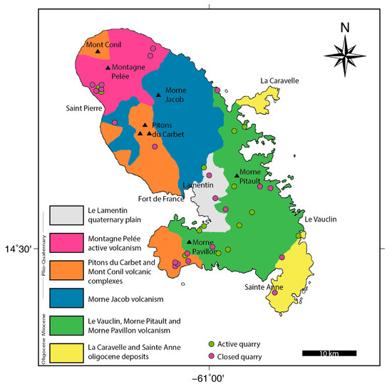 Located in the eastern Caribbean, the French West Indies are part of the Lesser Antilles arc [9]. They range south to north along the Caribbean plate boundary (Figure 1), where the North and the South American plates are subducting beneath the Caribbean plate. The geology of these islands is characteristic of subduction arcs, with a variety of volcanic formations along with scarce plutonic rocks and sedimentary deposits that form large carbonate platforms. The arc has been quasi-continuously active since the Eocene [10], with an inward migration of volcanism in its northern half. This has resulted in a variety of islands with either steep or shallow-shelf topography and an interbedding of volcanites and sediments. The Cenozoic migration of magmatism has also led to the formation of two distinctive sets of islands, the most recently active forming an internal arc (from Martinique to the Virgin Islands) and the others being associated with an inactive, older arc (Eocene to Miocene). From Dominica and further south, the two arcs, active and Eocene, are superimposed since very little migration occurred. Martinique island is formed by the two arcs. In the south and the east, Oligocene volcanic formations outcrop, the volcanic rocks are Miocene in the central part of the island and Plio-Pleistocene further west and north (Figure 2). The age variation of the volcanism, from east to west, from Oligocene to the Montagne Pelée active volcano, underlines the cenozoic westward migration of the magmatic activity. In Guadeloupe, the volcanic activity is occurring in the western part (Basse-Terre) and the eastern part (Grande-Terre) is covered with a carbonate platform (Figure 3). The typology of rocks that outcrop is then separated, with massive andesites, suitable for producing dimension stones, in the West and limestones, suitable for lime production, in the East.