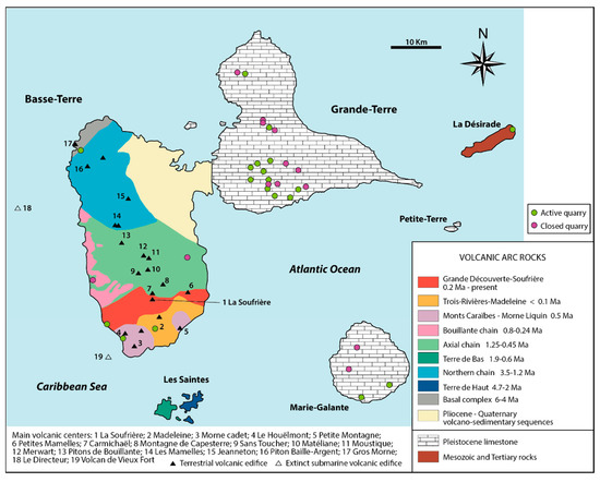 Simplified geological map of Guadeloupe, modified, after Komorowski et al., 2004 [13]. Active and closed quarries referenced in the national database InfoTerre [12] (for active quarries in 2019, see Figure 4).