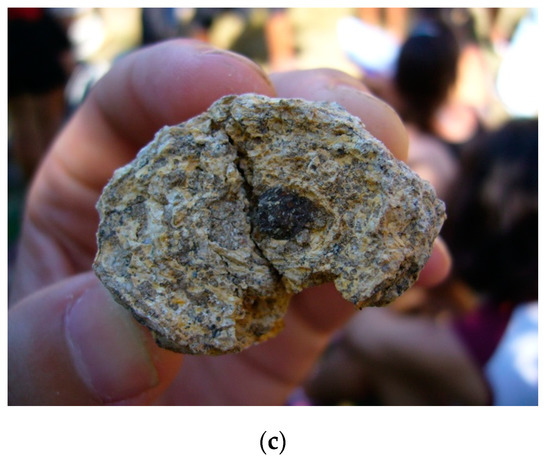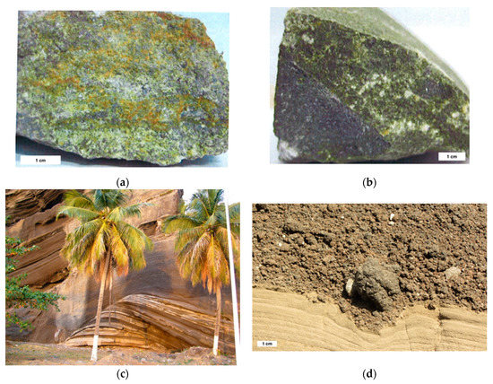 Basaltic andesite from Deshaies quarry, Guadeloupe (a) “Concrete” rock; (b) “Road aggregate” rock. Note the unaltered minerals on the fresh cut. Pictures a and b are from S.A.D.G. 2008 [17]. (c) and (d) volcanic deposits from Rivière des Pères, Monts Caraïbes, Guadeloupe. This outcrop is a geosite referenced in iGeotope; it is located one kilometer south of the Rivière des Pères quarry.