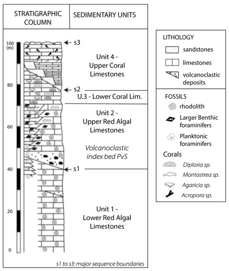 Synthetic stratigraphic log of the Grande-Terre and Marie Galante carbonate platform, Guadeloupe, from Conesa et al., 2012 [20].