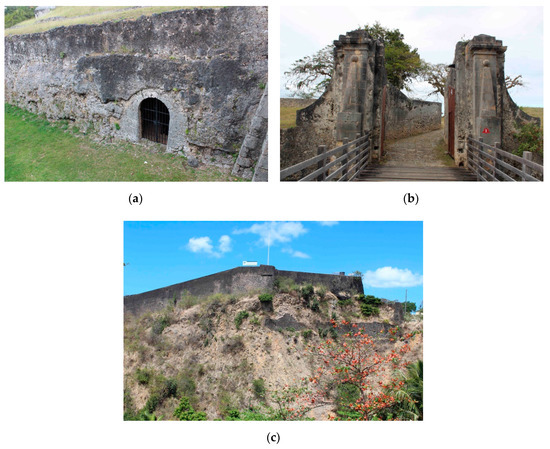 (a) Foundations of the Fort Fleur d’Epée, Guadeloupe. Entrance of a tunnel, excavated in the limestones, and inner wall of the fort, directly on the rocks; (b) main gate of Fort Fleur d’Epée with dimension stone ornamentations made with Basse Terre andesite; (c) northern fortifications of Fort Delgrès, Guadeloupe, above the gorge of Galion river. Note the unconsolidated debris flow materials, from La Soufrière volcano, forming the escarpment.