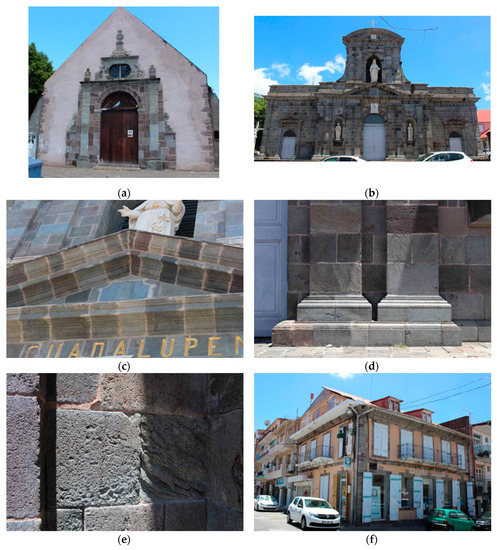In Guadeloupe, natural stone religious buildings from the colonial period are found only in Basse-Terre, where volcanic rocks were quarried. They principally consist in the church of the village of Vieux-Habitants and the cathedral of Basse Terre city (Figure 10a–e), as well as several small chapels. Vieux Habitants’ church was built in 1703, after the original wooden construction was burned in an act of war. Most of the edifice is recent (rebuilt in the 20th century) and now covered with an impermeability coating. Nevertheless, its original ornamental dimension stone main gate is preserved. It is made of greenish and reddish andesite. The facade was carved by workers from central France (Massif Central), were similar rocks are traditionally used [31]. The Basse Terre cathedral was built shortly after, in 1730, and displays a more important use of natural stone [32], especially for the facade, the vault, and the ornamentation.