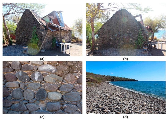 Natural stones houses in the French West Indies are mainly concentrated in the civic centers of Basse-Terre, in Guadeloupe (Figure 10f) and Saint Pierre, in Martinique (see Section 5.1 and Figure 13). There, some historical buildings are made with local dimension stones. Outside the main cities, only scarce natural stone houses are still preserved. They are usually made with boulders, but almost never with dimension stones. The house near the hamlet of Thomas, in Guadeloupe, is an example of local construction with pebbles collected directly on site, the house being only a few meters away from the beach (Figure 11). Unfortunately, this construction is not protected and in a very poor state of preservation. The detail view of the walls shows that the rocks used are of various volcanic origin and size, with little cement. As only a small quantity of lime was needed for these types of constructions, usually the builders were collecting limestones from beach debris or even extracting coral-bearing rocks in shallow waters.