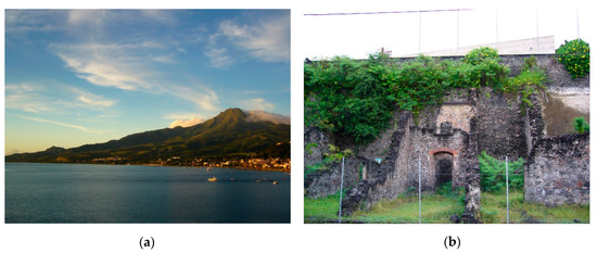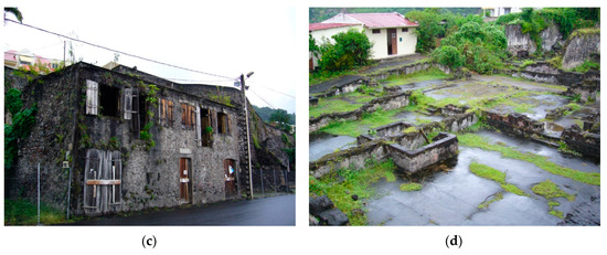 In the French West Indies, from the 17th to the early 20th century, the city of Saint Pierre in Martinique and the city of Basse Terre in Guadeloupe were the main economic centers. Consequently, this is where natural stone buildings were concentrated. These cities have benefited from abundant water resources and prosperous soils for agriculture due the proximity of volcanoes, as well as favorable conditions for sailing ships trade. In the 20th century however, the transformation of the economy has been accompanied with a translation of the activity toward the central zones of the islands. Furthermore, both sites were impacted by volcanic eruptions. In Martinique, the Montagne Pelée volcano erupted in 1902 and 1929 [37,38,39]. The eruption of 1902 resulted in the dramatic destruction of the city of Saint Pierre and the death of more than 28,000 inhabitants [40,41,42]. The city was hit by nuée ardentes and pyroclastic flows and the ruins are still preserved (Figure 13). This eruption is a milestone for the development of both volcanology and risk studies. Indeed, it is the first volcanic eruption that has been monitored with the tools of modern science and it is the first time a risk, known by the scientists, has led to a warning to the authorities that has been ignored due to political reasons (the local authorities refused to order the evacuation of the population as suggested by the scientists because some elections were about to take place) [43,44]. Thus, the patrimonial value of Saint Pierre dimension stone buildings is related not only to their architectural specificity within the French West Indies, but also to the history of the city. In Guadeloupe, the city of Basse Terre was never struck by a catastrophic volcanic event, since the last magmatic eruption date from 1530, before the city was built [45]. However, several phreatomagmatic events have occurred on La Soufrière volcano since. The last one, in 1976, triggered intense debate among the scientists and the authorities. It resulted in the evacuation of the south of Basse-Terre for several months [46,47]. This accelerated the process of translation of the economic activity toward the geographical central part of Guadeloupe. However, unlike in Saint Pierre, the main territorial administrations are still located in Basse Terre city, allowing the preservation of its dynamism and its population density. Nowadays, although the historical dimension stone buildings are still in use, they suffer from the lack of sufficient preservation efforts.