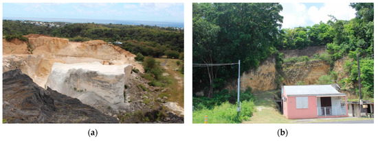 In order to follow the increasing demand, the production needs to rise and the impacted surface widens. On small territories, and the West Indies being a hotspot for biodiversity, this is a source of debate and conflicting interests within the society [48]. Recently, some quarries have been authorized to mine adjacent areas, providing they take biodiversity loss compensation measures [14]. Although the extraction of andesites, which requires mining techniques, is restricted to only a few sites, the softness of the carbonate platform limestones in Guadeloupe allows an easy mechanical extraction. In the Grands Fonds area, south of Grande Terre, Guadeloupe, seven authorized quarries are active and three others are located around the Grand Fonds and in Marie-Galante. However, in many places, the limestones are extracted without mining authorization, for earthwork purposes. The landscape appears to be strongly impacted (Figure 14).