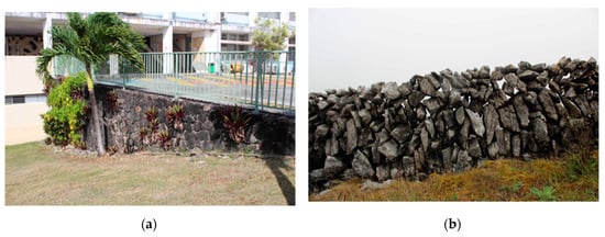 The transformation of the society in small island territories and the intense weathering of geomaterials under tropical climate are putting the preservation of the natural stone architectural heritage, as well as the geological natural heritage, under growing tension. In Martinique, the ruins of Saint Pierre are remarkable because of both the history of the destruction of the city and their rare dimension stone architecture. The volcanic crisis of 1902 and 1929, accelerated to the abandon of the architectural style of the 19th century and, with the use of modern materials, the know-how has not been transmitted. In Guadeloupe as well, the natural stone architectural heritage is poorly preserved and not all historical buildings benefit from a protection. However, many constructions demonstrating the preservation of the traditional know-how can be seen in the French West Indies. For example, some natural stones walls are still made with the same techniques as in the 17th to 19th century (Figure 15a). In Saint Barthélémy, preservation efforts are being made and stone walls are still being built and keep structuring the landscapes of the island. However, they are no longer used for field separation but rather along the roads. According to modern standards, these walls use natural stone, but not dry stone (Figure 15c,d). This solution, that doesn’t follow the traditional building modes, has been favored for esthetical considerations as well as for preventing earth, dirt, or any objects to be wind-pushed on the road. Traditionally, dry stones walls were preferred in Saint Barthelemy, which allowed the rain water to flow downhill during the rainy season. Today, during the heavy rain events in Saint Barthelemy, the water occasionally accumulates along the road-side stone walls, sometimes damaging the soils and infrastructures. In Europe, in areas submitted to strong wind episodes, dry stones were also favored for their resistance, as the space between the stones allows the wind to go through. In the Burren, Ireland, the stones are oriented in a manner that minimizes the resistance to the wind and that leave significant empty spaces in the wall, in order to let the airflow easily (Figure 15b).