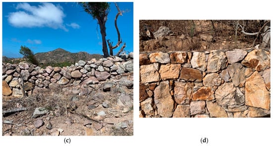 (a) 1970’s natural stones wall in the University campus, Guadeloupe. To be compared with Figure 11c; (b) dry stone wall in the Burren, County Clare, Ireland. The stones are oriented in a manner that minimizes the resistance to the wind; (c) dry stone wall at the bottom of a hill in Saint Barthelemy; (d) modern road-side stone wall, Saint Barthelemy.