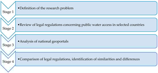 The main research problem was to identify similar regulations concerning access to public waters. The applicable laws were analyzed in several countries characterized by different levels of economic development. The following countries were analyzed in this study: Poland, Netherlands, France, United Kingdom, and the United States of America. The selected countries follow two different legal systems: the civil law and the common law. Poland, Netherlands, France, and the UK are European Union members which have to incorporate EU regulations into their national legal systems. Directive 2007/2/EC of the European Parliament and of the Council of 14 March 2007 establishing an Infrastructure for Spatial Information in the European Community (INSPIRE) [] was introduced to guarantee the consistency of spatial data in the EU Member States. According to Art. 288 of the Treaty on European Union and the Treaty on the Functioning of the European Union [], a directive is binding, as to the result to be achieved, upon each Member State to which it is addressed, but it leaves to the national authorities the choice of form and methods. A comparison of these forms and methods demonstrates the manner in which directives are implemented in the EU Member States, including the types of data that are displayed in the national geoportals. The countries that were selected for this study share certain characteristics which can be used to verify the research hypothesis. The USA was chosen for the analysis because water access in that country is regulated by the common law, and the relevant solutions provide valuable information de lege ferenda.