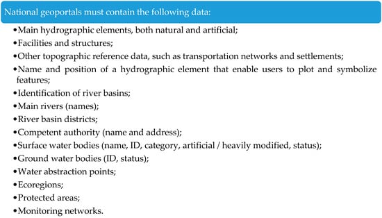 These types of spatial data (Figure 2) can be presented in thematic layers or separate maps in national geoportals. The INSPIRE Geoportal website [] lists European geoportals and the types of metadata presented by each geoportal. The website contains links to national geoportals. The laws regulating water resources in the US were discussed in this article, and the American geoportal was also analyzed.