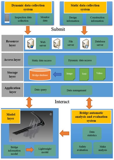 The bridge automatic analysis and evaluation system relies on the data center to obtain various types of data required for bridge condition assessment, bridge data statistics, and in-depth analysis. Through the calculation and the analysis of relevant models and algorithms, output evaluation, statistics, and analysis results are obtained and submitted to the data center. Also, the evaluation results would be presented in the bridge model.