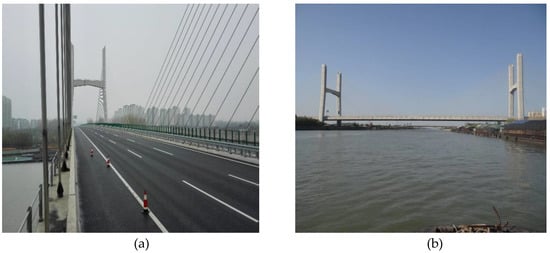The Beijing–Hangzhou Grand Canal is the longest artificial river in the world, starting at Beijing, passing through Tianjin and provinces of Hebei, Shandong, Jiangsu, and Zhejiang, and finally arriving in the city of Hangzhou. The total length of the Grand Canal reaches 1776 kilometers. The Beijing-Hangzhou Grand Canal Bridge is located at the south of Yangzhou, Ning yang Expressway. As is shown in Figure 8, the main bridge across the Grand Canal is a double-tower semi-floating system concrete cable-stayed bridge, the length of which is 464 meters (108 m + 248 m + 108 m). On each side of the main bridge is 11-span (6 × 30 m + 5 × 30 m) prefabricated, prestressed concrete approach bridge.