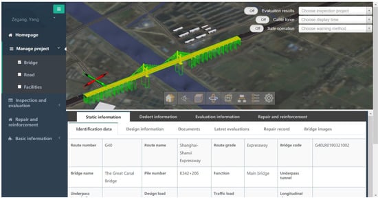 With the Web-BIM oriented approach, the stakeholders of the bridge can get access to the system through the Internet. The homepage of the system includes three parts: function modules, bridge model, and static information, as Figure 9 shows.