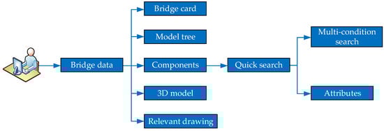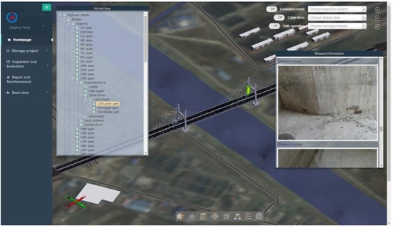 With the huge inventory of Chinese bridges, maintenance of these bridges becomes especially important and challenging. An informationalized management system is helpful and necessary. Many BMS have been developed, and fairly good practical results have been achieved, such as GIS-based BMS [24], visual inspection data-based BMS [25], and consecutive condition assessments-based BMS [26]. In this paper, we introduce a BIM-based BMS. The main target is to increase the management efficiency, make it visualized and easy to use, and provide a collaborative management platform for all people involved in the projects. To realize it, the bridge management system should: