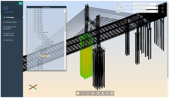 Static information management in this BMS platform was established and is shown in Figure 10. This system accumulates the scattered information in the design and the construction phases to formulate the “bridge life card”. The results indicate that users could choose the members in the bridge model to query corresponding static information such as design drawings, design parameters, material usage, etc. Moreover, the model tree is one type of dendrogram based on the hierarchy characteristic of the model, which is provided for accurate localization of members in the model. As Figure 11 shows, users can unfold the dendrogram to click the pile foundation of thirteenth span, which was highlighted in the model automatically.