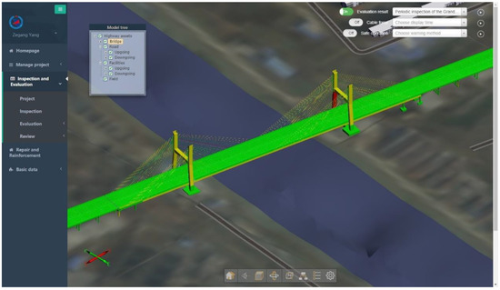 Based on the defect information collected by the mobile terminal, the evaluation system can make automatic analysis and calculate the scores of the members according to the bridge maintenance standard. Then, the bridge information model displays different colors on the members to intuitively describe the technical condition of different levels of the whole bridge. Figure 14 shows the evaluation results of the Grand Canal Bridge. The members in green color stayed in a safe state, and the members in yellow suffered light damage. The red color means the members have been damaged severely, and corresponding measurement should be considered.