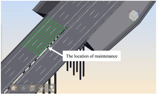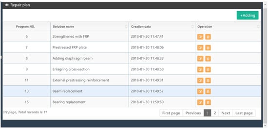 Repair and reinforcement information of the bridge is stored in the system and can be searched by users. The defects of the bridge, such as cracking, usually develop as the time grows. When the defect develops to a certain extent and threatens the structure safety, the system automatically sends text messages to bridge managers to remind them to create a repair and reinforcement project. Besides, the system regularly generates statistics, graphs, and tables according to inspection and monitoring information. Based on these functions, the BIM-based system helps to make auxiliary maintenance decisions. As shown in Figure 15, users can view the relevant information on the repair plan in this module. After this reinforcement and repair, one can determine whether the maintenance is qualified or not according to the actual situation. The maintenance can be displayed through the model, and the repair results can be check by the managers, as shown in Figure 16. Based on this, the detailed information of the location and the effects of this reinforcement can be obtained.