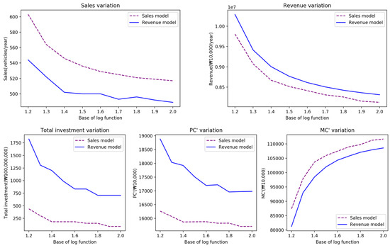 The base of the logarithmic function played a role in how the total sum of the selected efficiency affected the reduction in the MC. Therefore, according to the change in the base in Figure 1, the MC was largely altered, which resulted in different objective values. When the base increased, the sales in the sales model and the revenue model decreased, but the sales in the revenue model rose by between 1.7 and 1.8. While the amount of the reduction in the MC decreased due to the base increase; by and large, the models decreased the total investment and thereby the PC’ decreased.