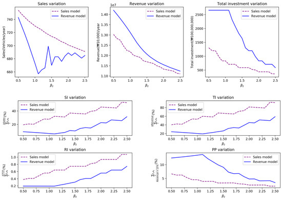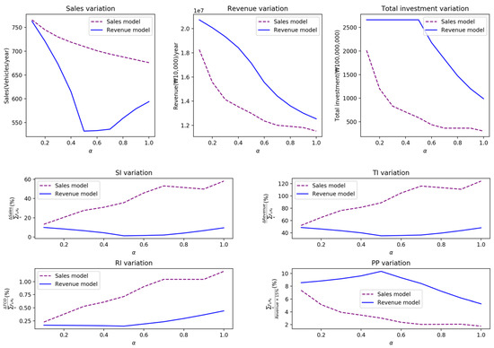 To observe the trend of the values of the sales and revenue models with market change, Case 10 (1, 1, ) was tested. In Figure 2, when increased gradually, the sales model decreased the total investment. By doing so, the sales and revenue both saw a declining trend. However, the revenue model, unlike the sales model, increased sales, when the total investment dropped. Additionally, it was noted that SI, RI, and TI all showed an increase owing to the reduction in the total investment. For example, when was 0.5 and 1.0, despite the sales being higher at 0.5, the SI was less than 1.0, owing to the reduction in the total investment, and the TI and RI were shown to have similar aspects to the SI. Figure 3 shows the trends according to the ratio of the total investment added to the PC in Case 3 (, 1, 1). The sales model showed similar aspects to the market change. However, the revenue model had different aspects. For example, the sales of the revenue model increased at 0.5, and the total investment decreased at the same time. By decreasing the revenue, the PP of the revenue model increased, and decreased when the total investment was reduced.