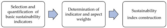 To establish the sustainability index in order to obtain a final numerical result [64], the weighted arithmetic mean (WAM) method is used to aggregate the indicators into the indices. A linear agglomeration function is given in Equation (3).