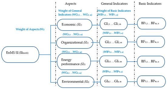 A hierarchical scheme for the EnMS SI is shown in Figure 2. Figure 2 shows the economic (SI1), organizational (SI2), energy performance (SI3), and environmental (SI4) aspects, represented by the economic general indicators (GI1,1 … GI1,m) and basic indicators (BI11,1…. BI1m,n), organization general indicators (GI2,1 … GI2,m) and basic indicators (BI21,1…. BI2m,n), energy performance general indicators (GI3,1 … GI3,m) and basic indicators (BI31,1…. BI3m,n), and environmental general indicators (GI3,1 … GI3,n) and basic indicators (BI41,1…. BI4m,n) [50], respectively.