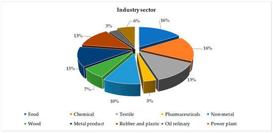 The questionnaire and interview data were collected and analyzed from the end of 2017 to the beginning of 2019. The questionnaires were sent to 108 companies in Thailand that had held an ISO 50001 certification for at least one year. The assessment of qualitative score levels for each basic indicator requires the evaluator’s understanding and an appropriate amount of supportive data. As a result, a great deal of time was spent responding thoroughly to the questionnaires. The questionnaires from 31 companies were returned, accounting for 28% of the companies engaged. The questionnaires were distributed to the types of industries shown in Figure 3.