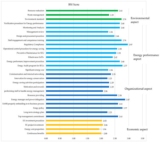 The results concerning the quality score levels of the activities and processes based on each indicator are shown to be comparable to the Energy Management Maturity Model (EM3) and the Energy Management Maturity Model based on ISO 50001 (EMMM50001) [36,41,42]. The assessment results, which are in accordance with EMMM50001, show an increase in the score levels during each EnMS process, based on the PDCA cycle guideline, from the EnMS establishment to the energy management review. The scores ranged from 1 to 5, depending on the advancement levels of the process (Level 1: Initial to Level 5: Optimized), provided that the levels of importance of the processes were equal [42]. However, the EnMS SI framework provides a more in-depth assessment of the quality and effectiveness of the indicators in each process of energy management and related areas (reducing the environmental impact, waste, and resources), thereby affecting organizational energy performance. From Figure 5, it can be seen that the EnMS SI obtained from the quality assessment of indicators, in conjunction with the aggregate weight values, has a significant impact on energy management sustainability, when considering the current status of each company. Seven companies have a sustainability index lower than 2.0, with company 18 exhibiting the lowest. Among these, companies 13, 15, 18, and 21 have quite a low score level in terms of the economic aspect. In contrast, nine companies have a sustainability index higher than 2.5, and company 16 has the highest. Based on the score levels for each aspect, the findings indicate that all companies in this group have a significantly high score for the economic aspect.