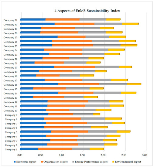 The assessment results for 30 sustainability indicators in 31 companies, together with the indicator weights obtained through the AHP, were applied to evaluate the aggregate value of sustainability indicators using the weighted arithmetic mean (WAM) method. The mean of sustainability indicators for each aspect is shown in Figure 4, and the calculation results for the aggregate value of the four aspects and the EnMS SI are shown in Table A3 in the Appendix A. The broader context of the EnMS SI for 31 companies can be more clearly seen in Figure 5.
